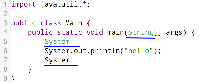 In the example below a person starts a statement "System...", but it's eagerly highlighted as a type (green).