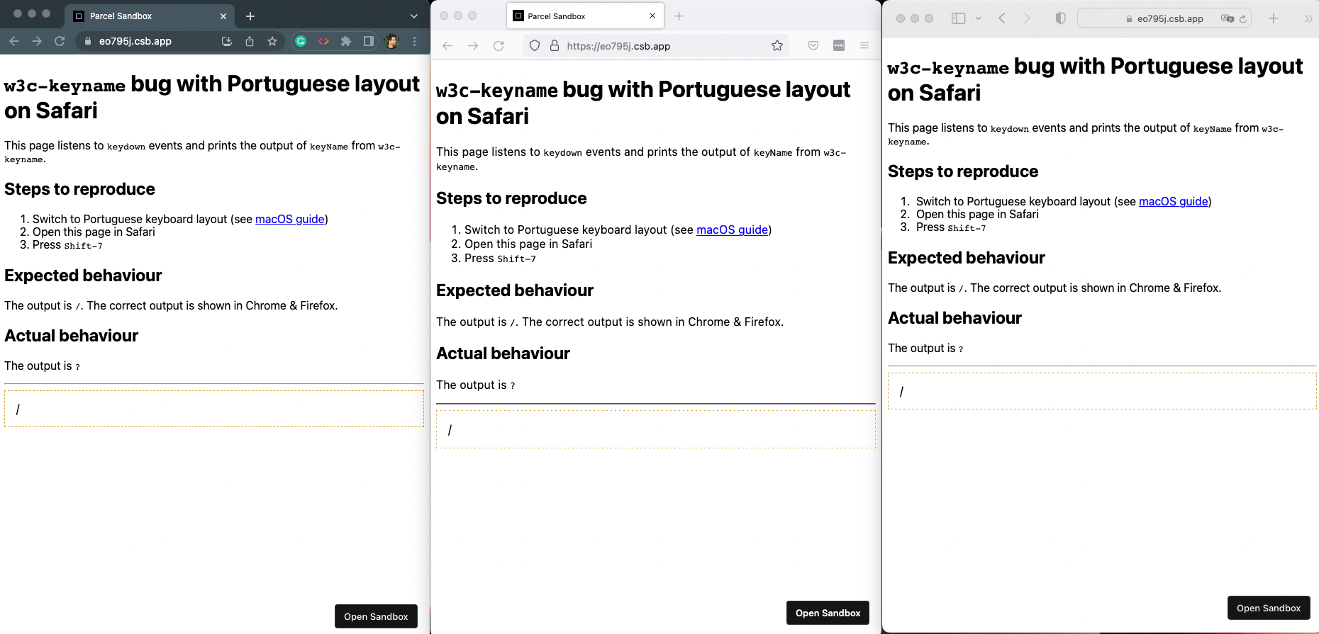 Shift-7returns?when it should return/. I've put together this minimal reproduction to demonstrate the issue. Here's some screenshots from a colleague with a Portuguese keyboard:Safari