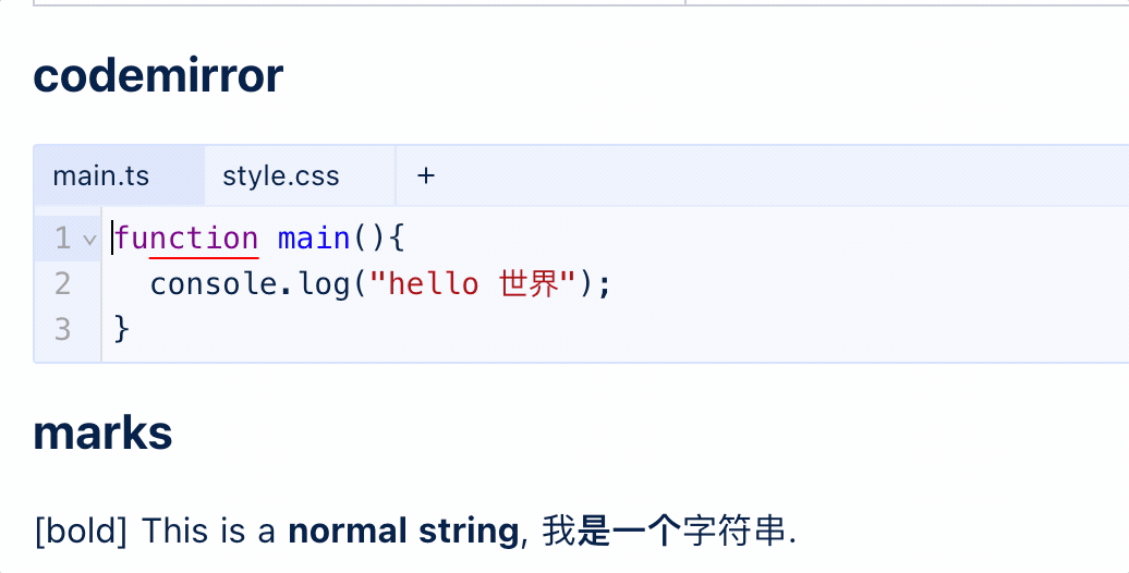 Similar to the official codemirror example, a code editor in prosemirror. The difference is that I am using the codemirror6 and the code editor have tabs.